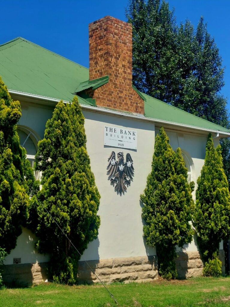 Our historical walk began at the Bank Gallery. Rita, who has all the right connections, had the code and keys to let us in. She explained its rich history: “This building began as a branch of Die Nationale Bank van Zuid Afrika in 1893. Over the years, it became Barclays and then First National Bank.” Sadly, the bank closed its doors in 2009, leaving the town with just one FNB ATM.